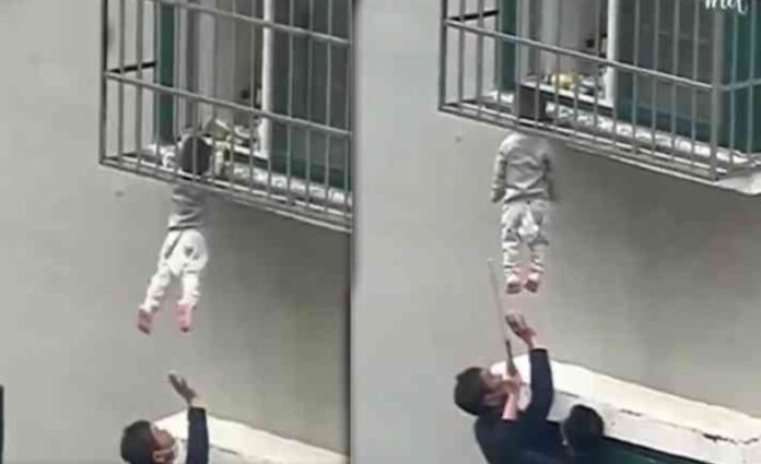 Dalam video yang viral dalam akun @cctvidiots yang tersiar pada Senin (24/4/2023), terlihat bocah tersebut terperangkap di jeruji jendela balkon dengan kedua kakinya terjulur keluar. Ketika anak tersebut berusaha melepaskan diri, dua orang dari lantai bawah terlihat berusaha menyelamatkannya.