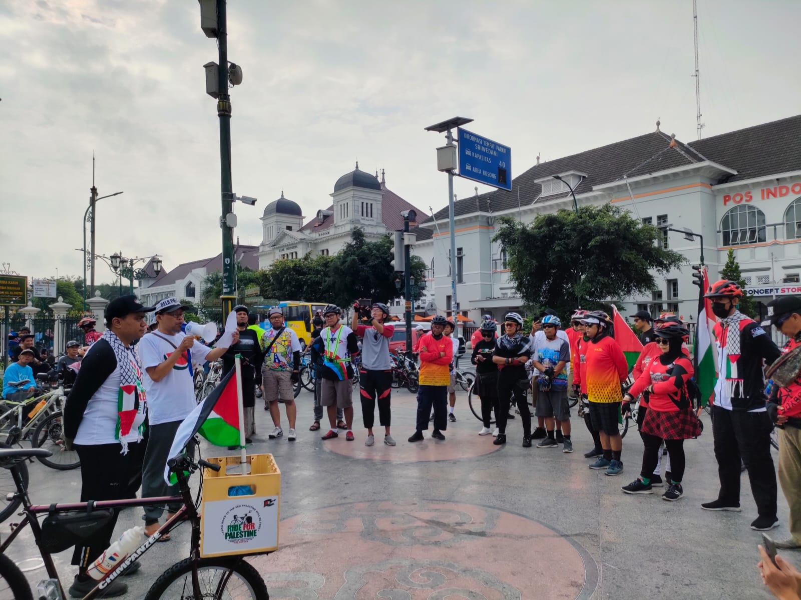 Sementara Lurah Condongcatur, Reno Candra Sangaji yang turut mengikuti aksi yang juga sebagai Pesepeda Jogja dari Algojo (Antar Lintas Gowes Jogja) juga membacakan pernyataan sikap menjunjung tinggi eksistensi pesepeda Jogja yang peduli dengan kemanusiaan dan menggalang donasi untuk perjuangan rakyat Palestina, bahwa Pesepeda Jogja mendukung penuh hak kemerdekaan untuk Palestina.