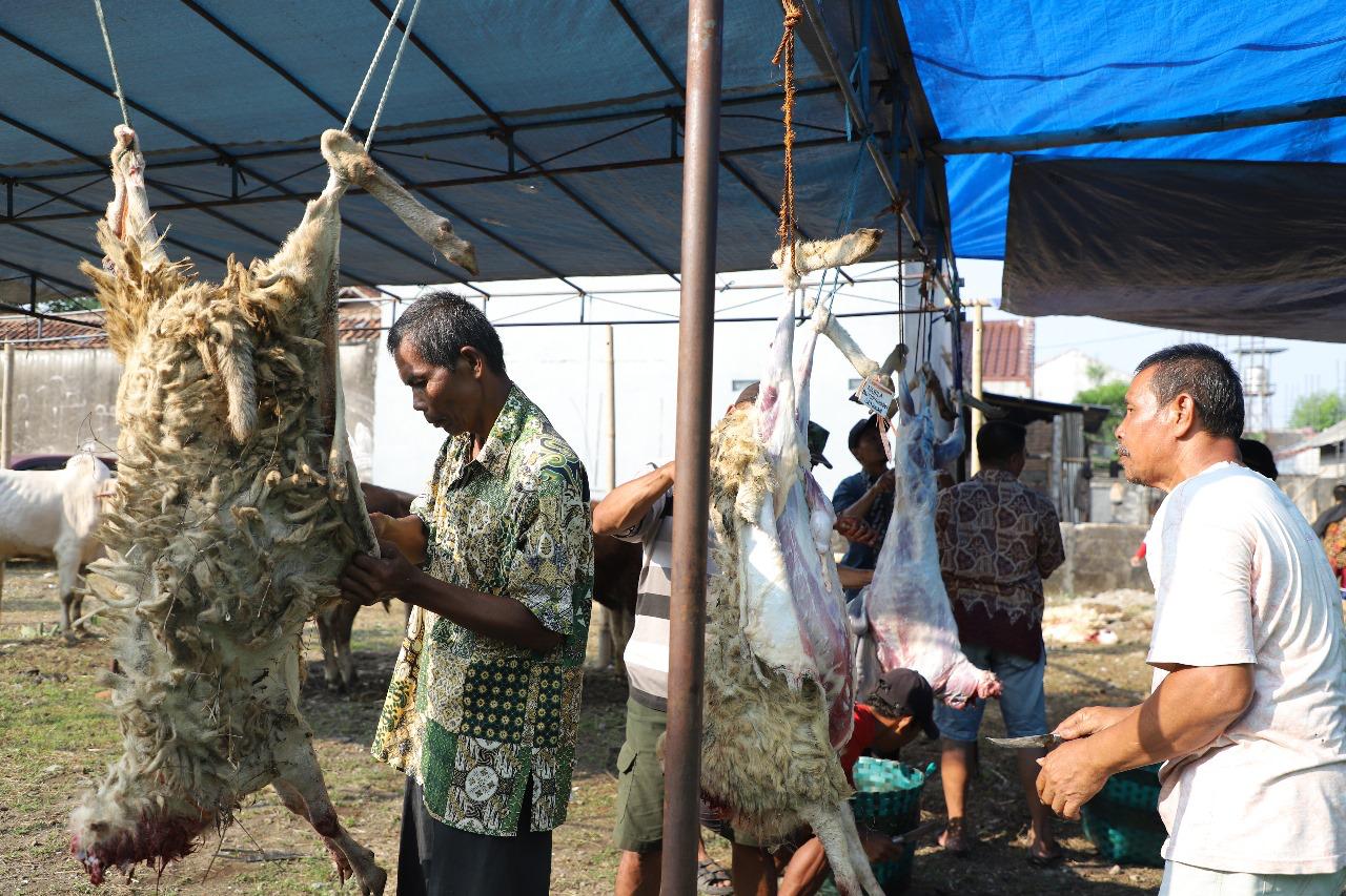 Petugas jagal tengah melakukan pengulitan ternak hewan kurban. /Foto: Ist