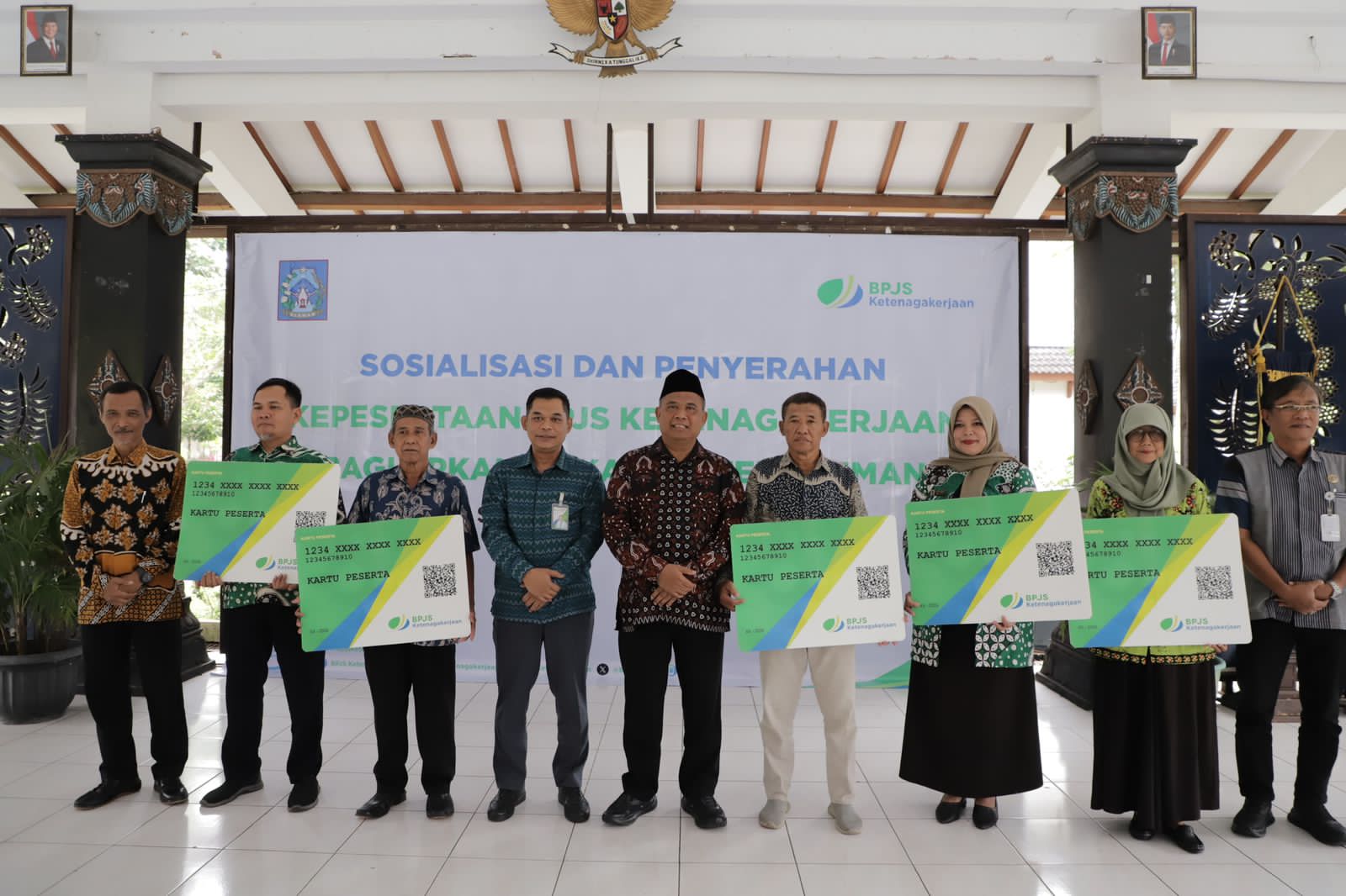 Kartu BPJS Ketenagakerjaan diserahkan secara simbolis oleh Bupati kepada lima perwakilan anggota BPKal dalam kegiatan sosialisasi perlindungan jaminan sosial ketenagakerjaan yang diselenggarakan Dinas Pemberdayaan Masyarakat dan Kalurahan (PMK) Sleman.