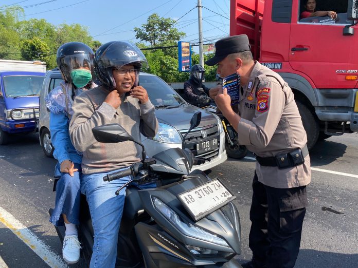 Personel Satgas Preventif Operasi Patuh Progo 2024 melakukan himbauan keselamatan berlalu lintas.