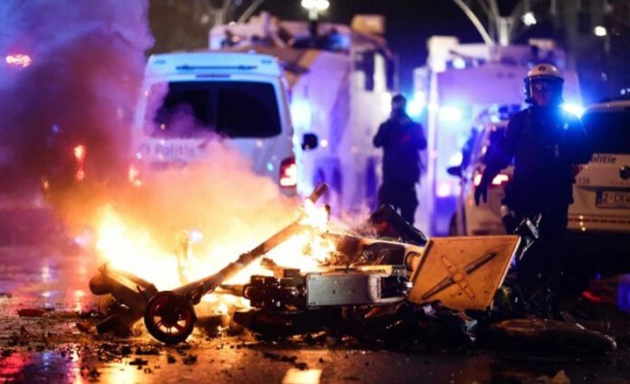 Tak lama setelah laga Belgia vs Maroko usai di televisi, puluhan fans tampak turun ke jalanan kota sambil memecahkan jendela toko, melemparkan kembang api, dan membakar sejumlah kendaraan.