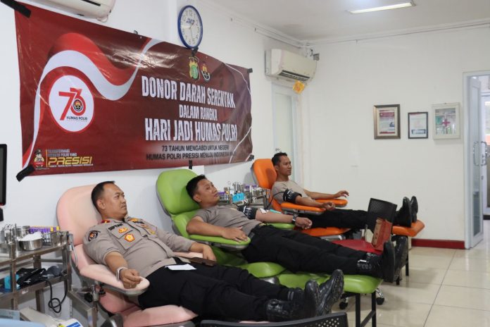 RADARNASIONAL – Personel Polresta Bandara Soekarno-Hatta (Soetta) donor darah di Kantor Palang Merah Indonesia (PMI) Kota Tangerang, Banten pada Rabu (30/10) siang.