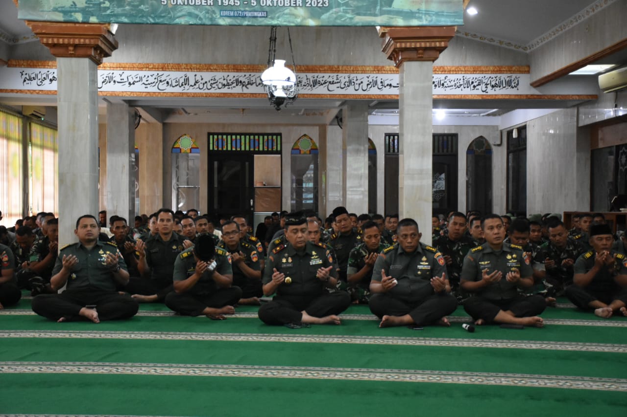 RADARNASIONAL – Dalam rangka HUT TNI ke 78 dan HUT ke 73 Kodam IV/Diponegoro, Korem 072/Pamungkas menggelar doa bersama di masjid Al-Hidayah Makorem 072/Pamungkas Jalan Reksobayan No. 4, Ngupasan, Gondomanan, Yogyakarta. Senin, (2/10/2023).