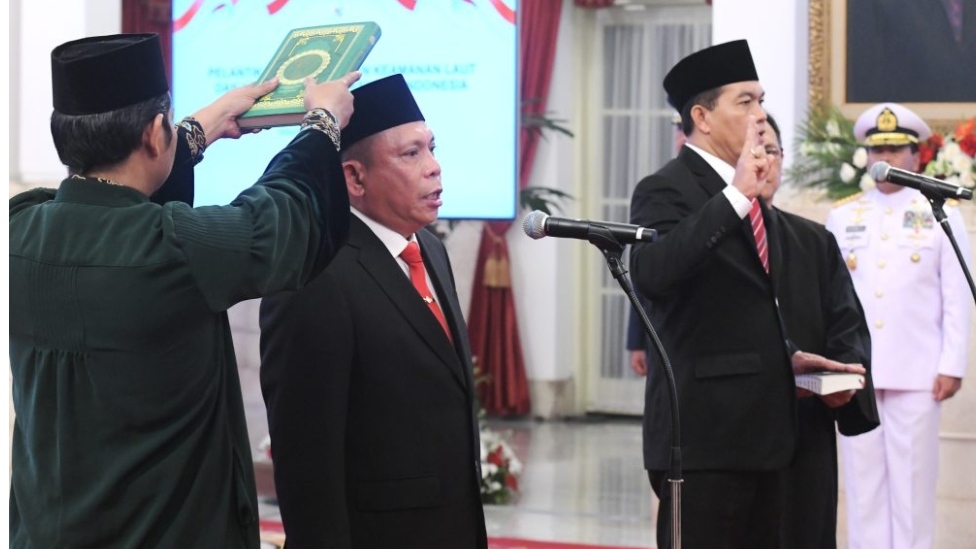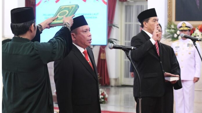 Presiden Jokowi melantik Laksamana Madya TNI Irvansyah sebagai Kabakamla dan Sahat Manaor Panggabean sebagai Kepala Barantin, Rabu (13/09/2023) siang, di Istana Negara, Jakarta. (Foto: Humas Setkab)