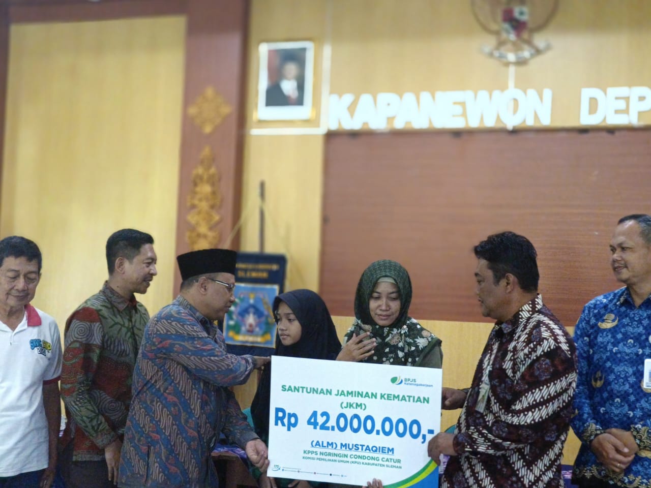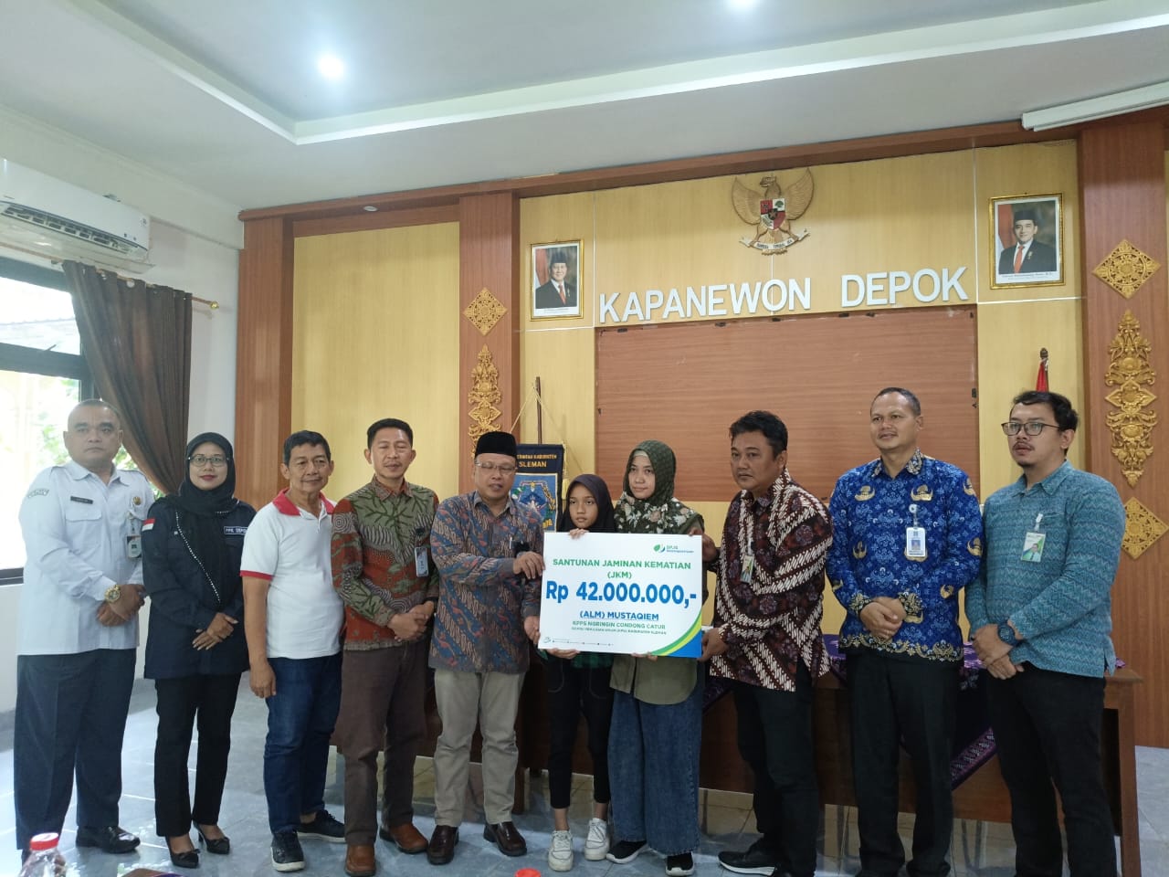 Panewu Depok, Wawan Widiantoro yang turut menyaksikan penyerahan simbolis Santuan Jaminan Kematian sebesar Rp. 42 juta kepada ahli waris Bp. Mustaqiem mengucapkan terimakasih kepeda KPU dan BPJS Ketenagakerjaan Sleman.