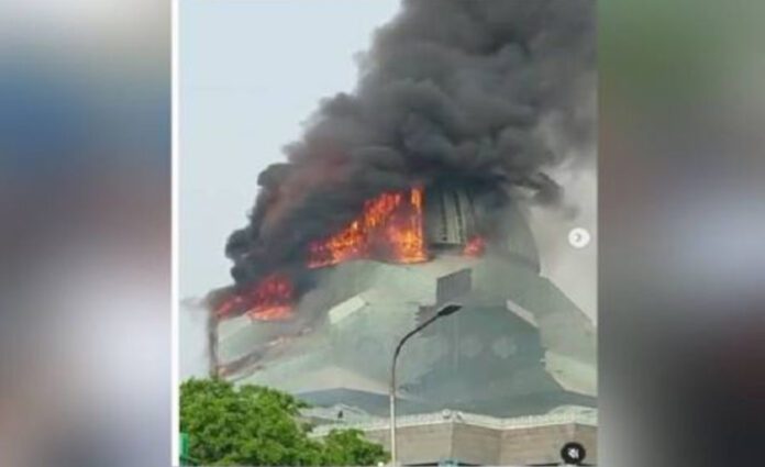 Dari video yang beredar di media sosial, tampak api berjatuhan di bagian dalam masjid.