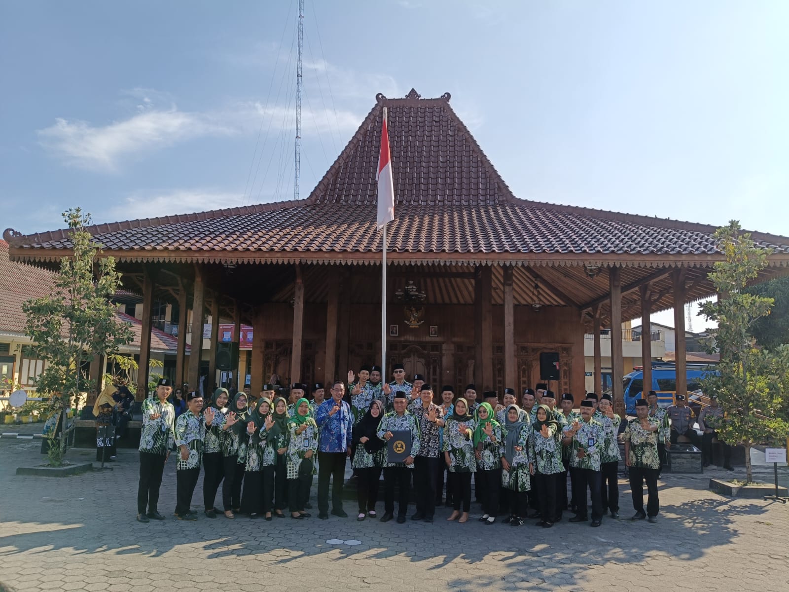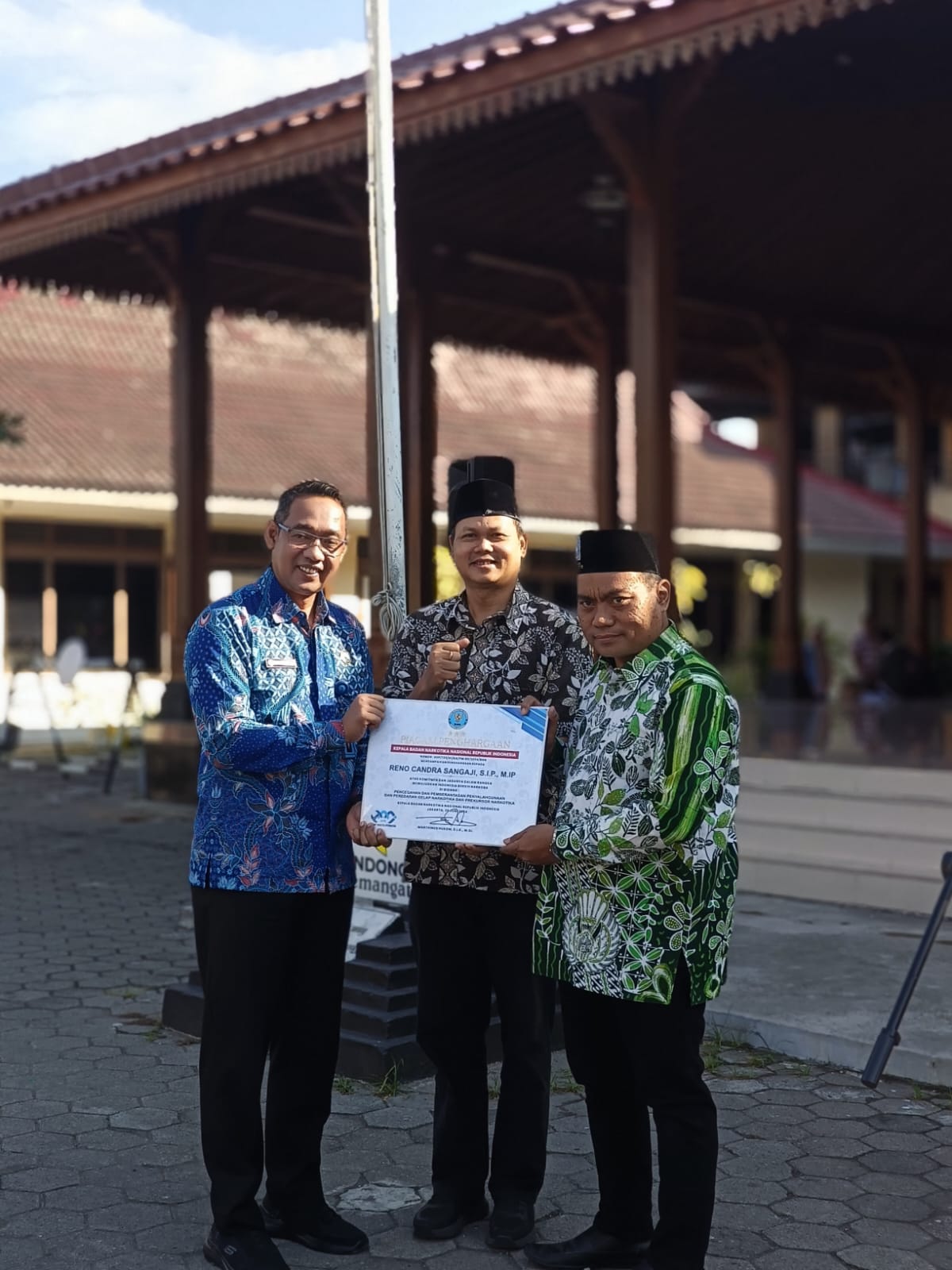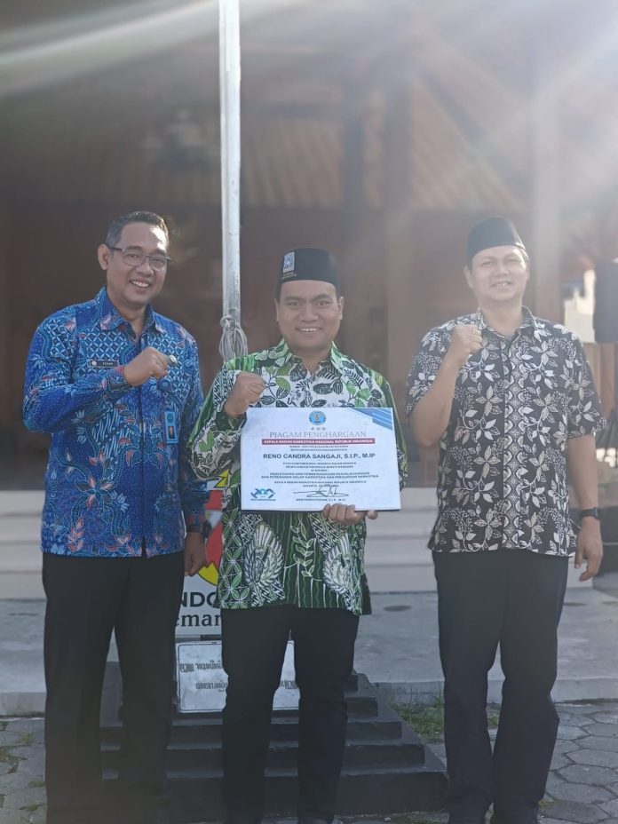 RADARNASIONAL – Lurah desa Reno Candra Sangaji didampingi Panewu Kapanewon Depok menerima penghargaan dari Kepala BNNK Sleman dalam apel di halaman Kalurahan Depok, Selasa (7/7/2024).