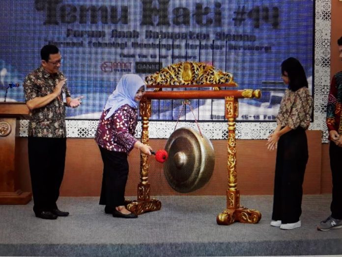 Secara simbolis Bupati Sleman Kustini Sri Purnomo membuka Temu Anak Sleman dengan pemukulan gong sekaligus mengalungkan tanda peserta kepada perwakilan Forum Anak Sleman.