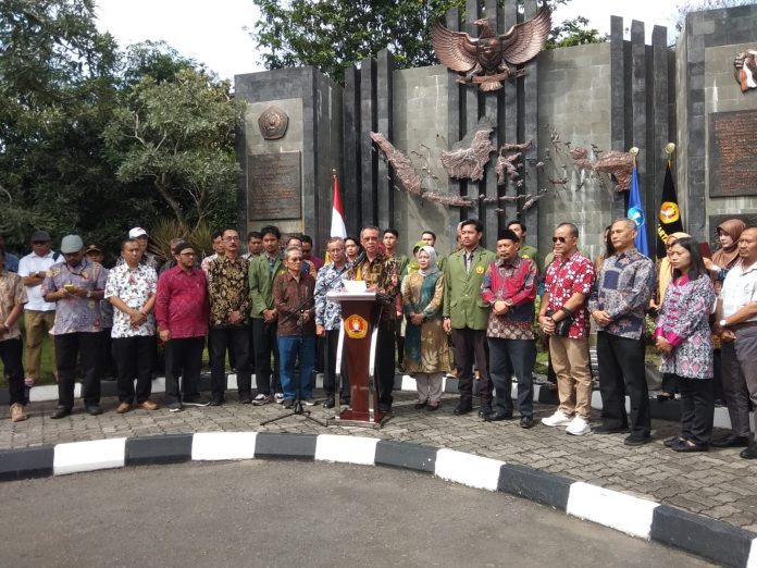 Guru Besar UPN “Veteran” Yogyakarta Prof. Dr. Ir. Condradus Danisworo ,M.Sc, membacakan dokumen pernyataan Sikap Civitas Akademik UPN “Veteran” Yogyakarta, mengatakan sebagai kampus bela negara yang didirikan oleh para Veteran pejuang kemerdekaan Indonesia, terdapat dua sesanti UPN “Veteran” Yogyakarta yaitu “Widya Mwat Yasa dan semangat Dharma Eva Hatto Hanti” yang menjadi landasan sikap ini.