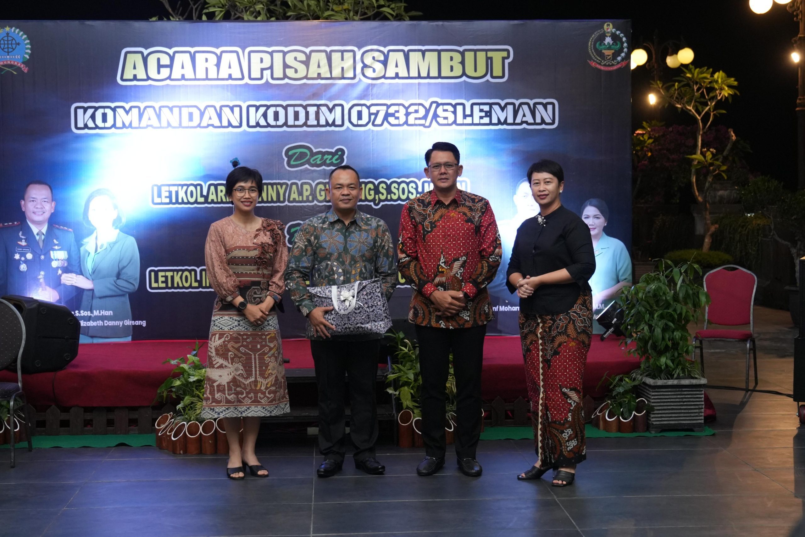Acara pisah sambut Komandan Kodim 0732/Sleman diakhiri dengan penyerahan cinderamata kenang-kenangan dari Bupati Sleman, Kustini Sri Purnomo dan Wakil Bupati Sleman, Danang Maharsa beserta jajaran Forkopimda Sleman kepada Letkol (Arm) Danny Arianto Pardamean Girsang.(San)