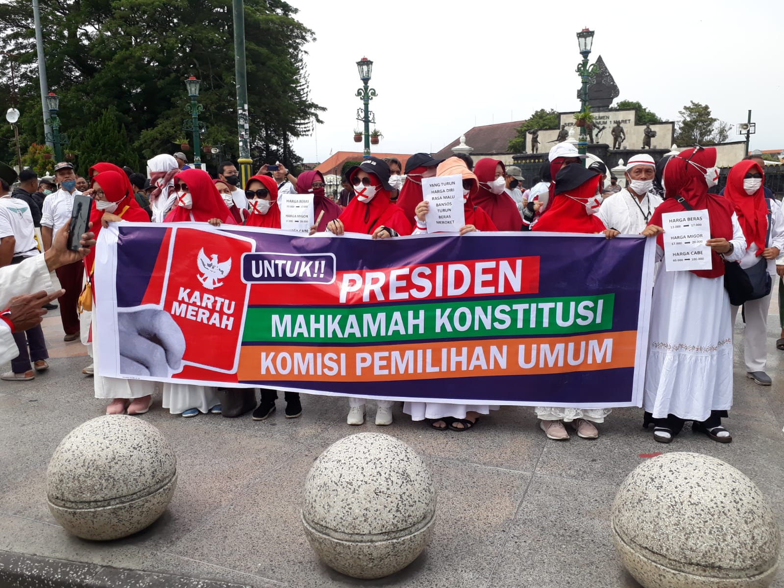 Pengunjuk rasa berorasi sebelum melakukan pernyataan sikap terhadap adanya berbagai kecurangan di depan Gedung Agung, Yogyakarta. Jumat(23/2/2024).