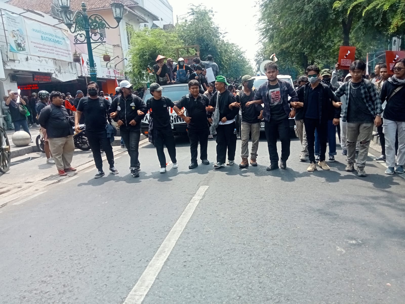 Sepanjang jalan Malioboro dipadati peserta aksi unjuk rasa menuju Gedung Agung dan titik nol kilometer Yogyakarta, Kamis (22/8/2024).