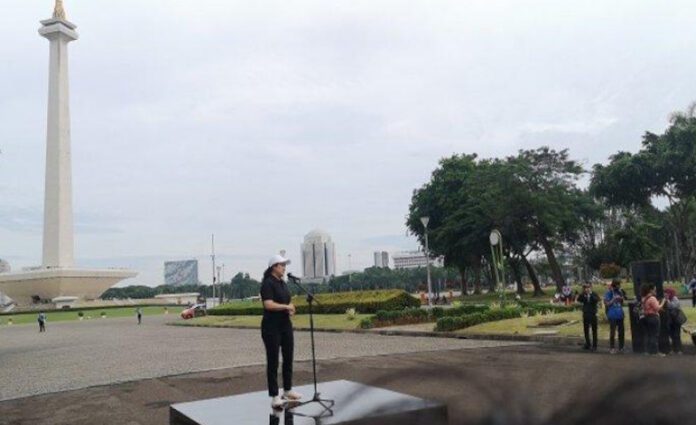 Puan dan Airlangga juga sempat bergaya untuk berfoto bersama dengan latar Tugu Monas di belakang mereka sebelum mencapai sisi tenggara Monas.