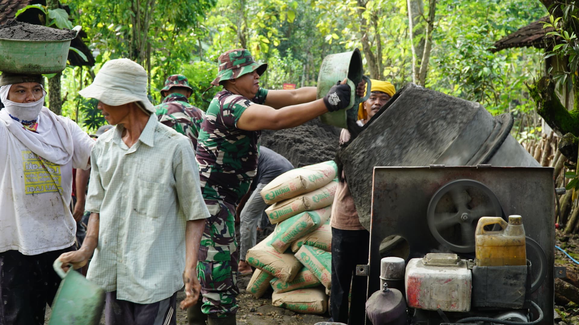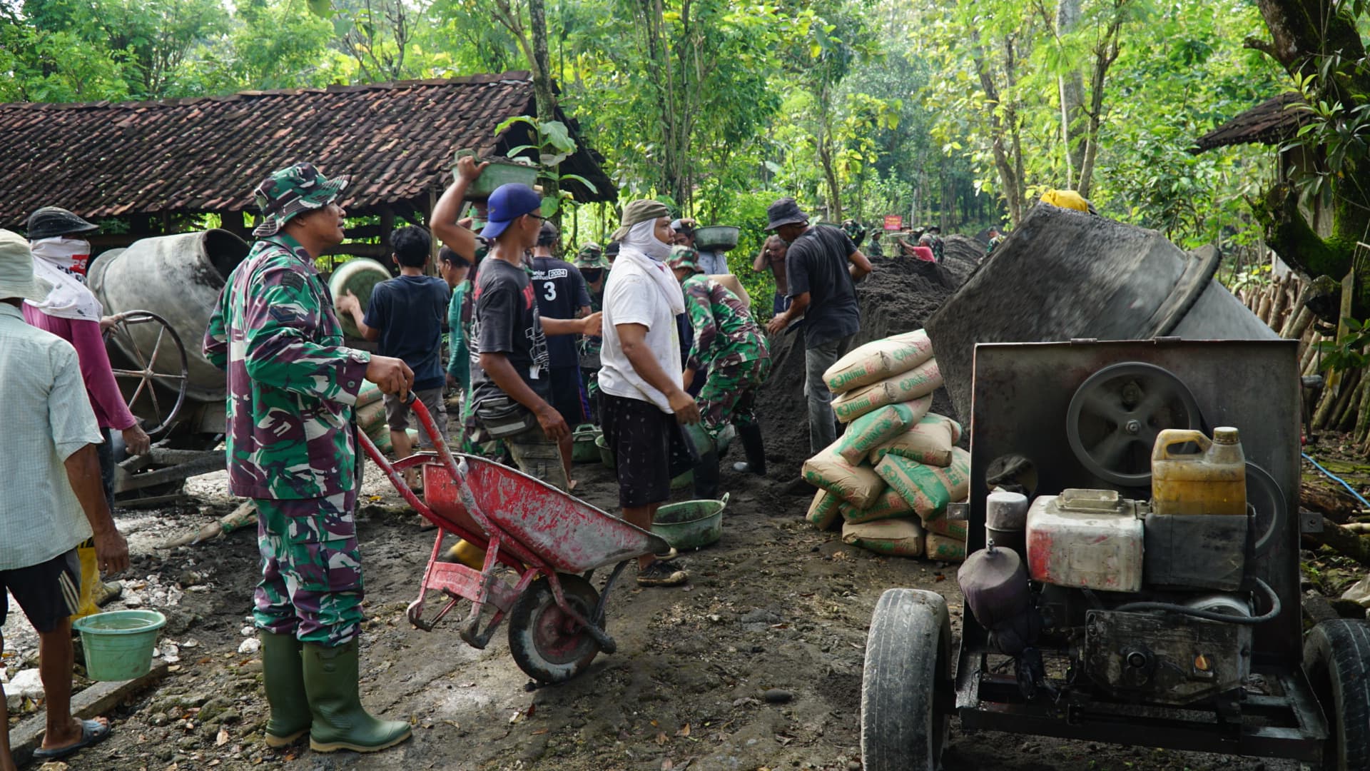 Meski cuaca cukup panas, prajurit dan warga bergotong royong melakukan pengecoran, mencampur adonan beton berlangsung.Proses ini merupakan bagian dari upaya TMMD untuk meningkatkan infrastruktur Desa,agar mempermudah akses transportasi bagi masyarakat setempat.
