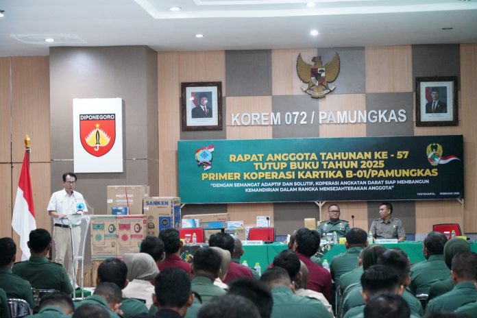 RADAR NASIONAL,(Yogyakarta) – Korem 072/Pamungkas menyelenggarakan Rapat Anggota Tahunan (RAT) Primkop Kartika B-01 Pamungkas ke-57 Tutup Buku Tahun 2025 dibuka oleh Kasipers Kasrem 072/Pamungkas Kolonel Inf Handoko Yudho Wibowo, S.E., S.I.P., mewakili Danrem 072/Pamungkas bertempat di Aula Sugiyono Makorem 072/Pamungkas, Jalan Reksobayan No. 4 Kota Yogyakarta, Rabu (11/2/2026).